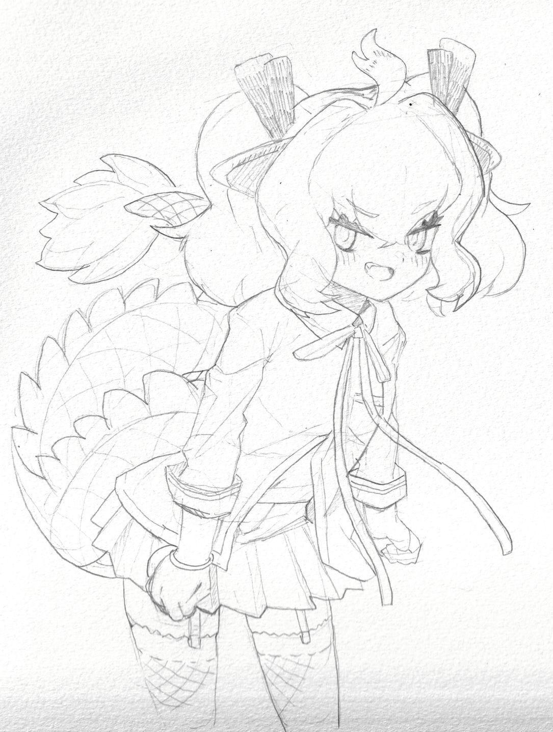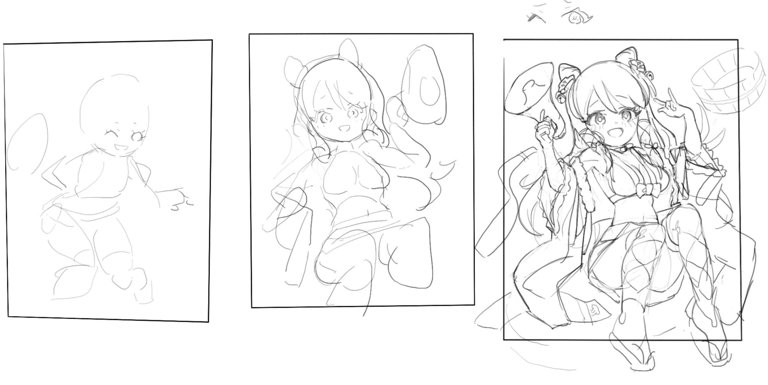 I did three rough drafts. First I drew the one on the left, then the one on the right. The one on the left is not a failure. There is a rough layout there. And the middle one is one step before the image I want to draw. Finally, with the rough on the right, I was able to get the shape I wanted to draw. However, at this point I forgot to give the illustration a story. She is in a meaningless pose.